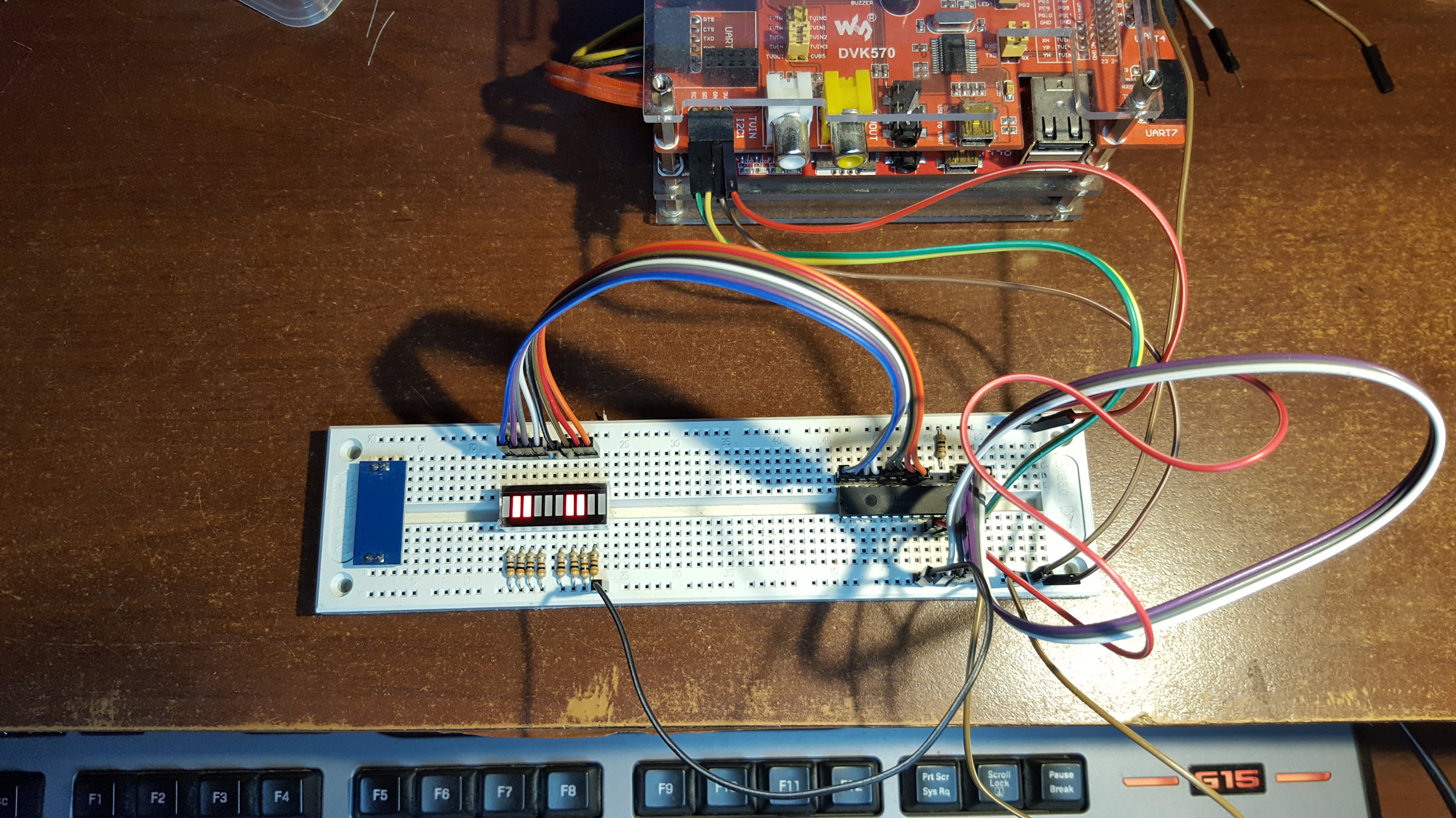 Rozbudujmy nasz układ o włącznik astabilny (mikroswitch), który pozwoli nam kontrolować przebieg programu. Do ostatniej linii GPIO portu B dołączmy nasz mikroswitch a jego drugą końcówkę dołączmy do masy układu. Warto zadbać o podciągnięcie (pullup) GPB8 do zasilania przez rezystor ograniczający (1k). Można użyć wewnętrznego rejestru GPPULB i użyć do tego celu rezystorów zawartych w układzie. Ja zdecydowałem się na użycie rezystora zewnętrznego.